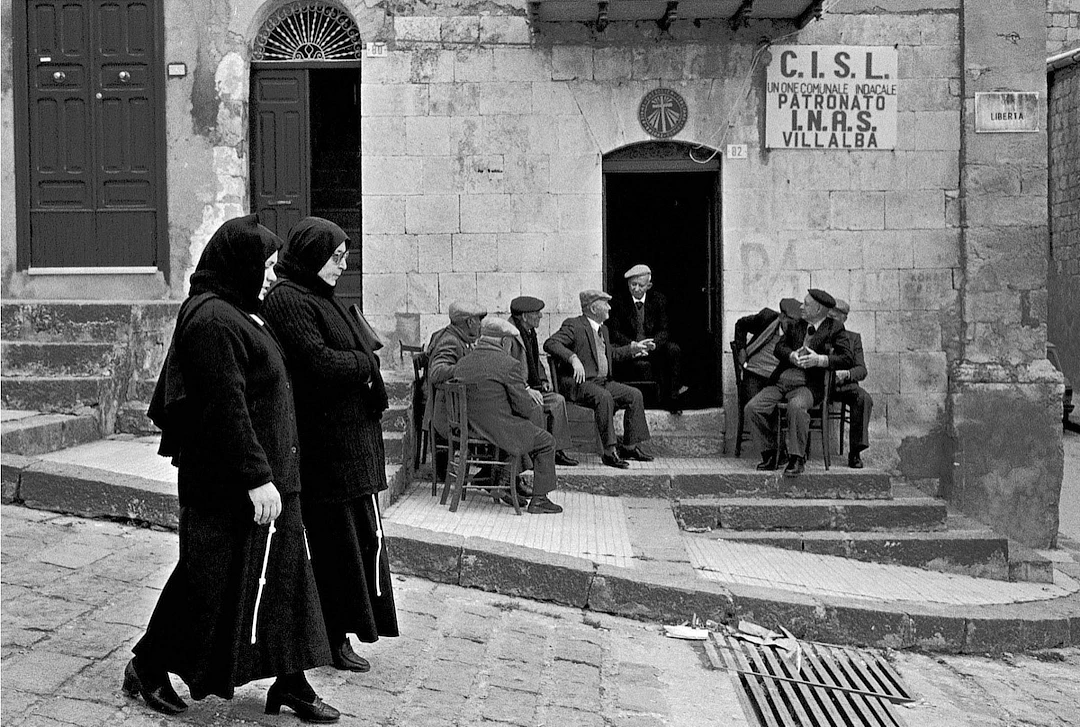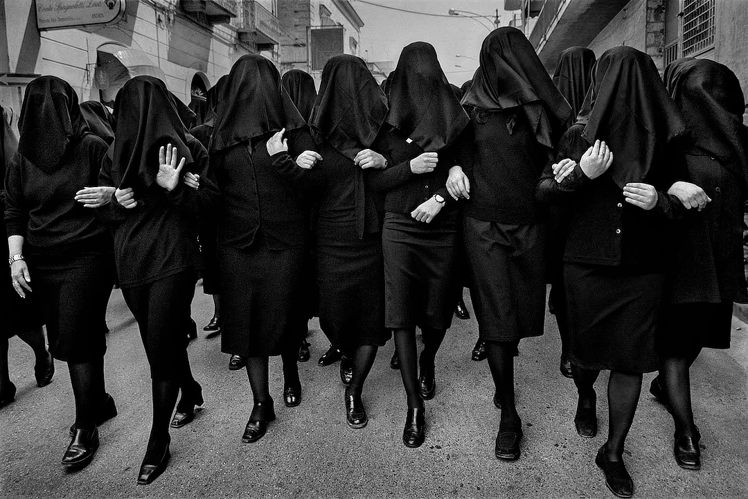 Ferdinando Scianna, nei riti della Sicilia, ha raccontato la religione come teatro del corpo e della comunità, dove fede, tradizione e identità si intrecciano.